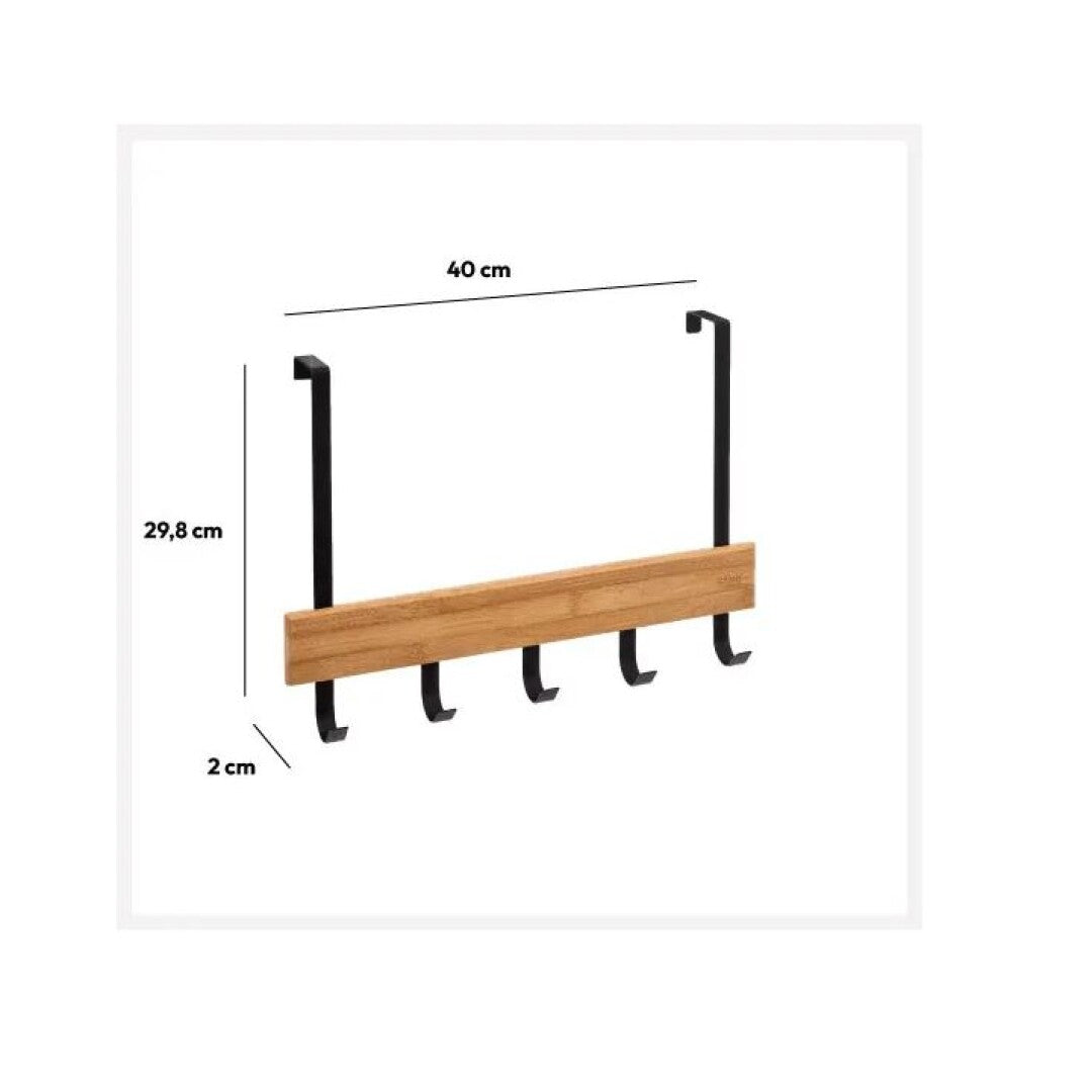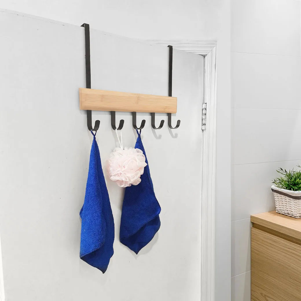 Maximize your bathroom space with this Over-the-Door Bamboo Hook Rack. Designed with a modern blend of natural bamboo and black steel, it features five sturdy hooks—perfect for hanging towels, robes, and more without the need for installation.