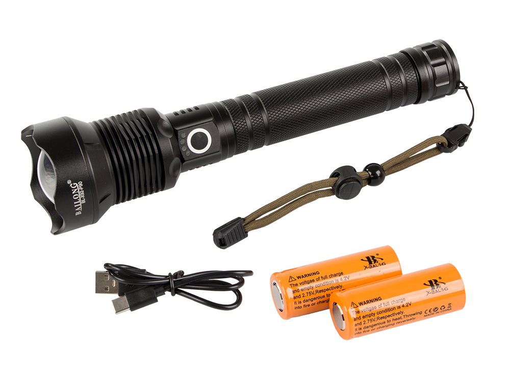 Complete Set: Flashlight, 2x 26650 batteries, 2x 18650 battery adapters, USB-C cable, wrist strap, original packaging