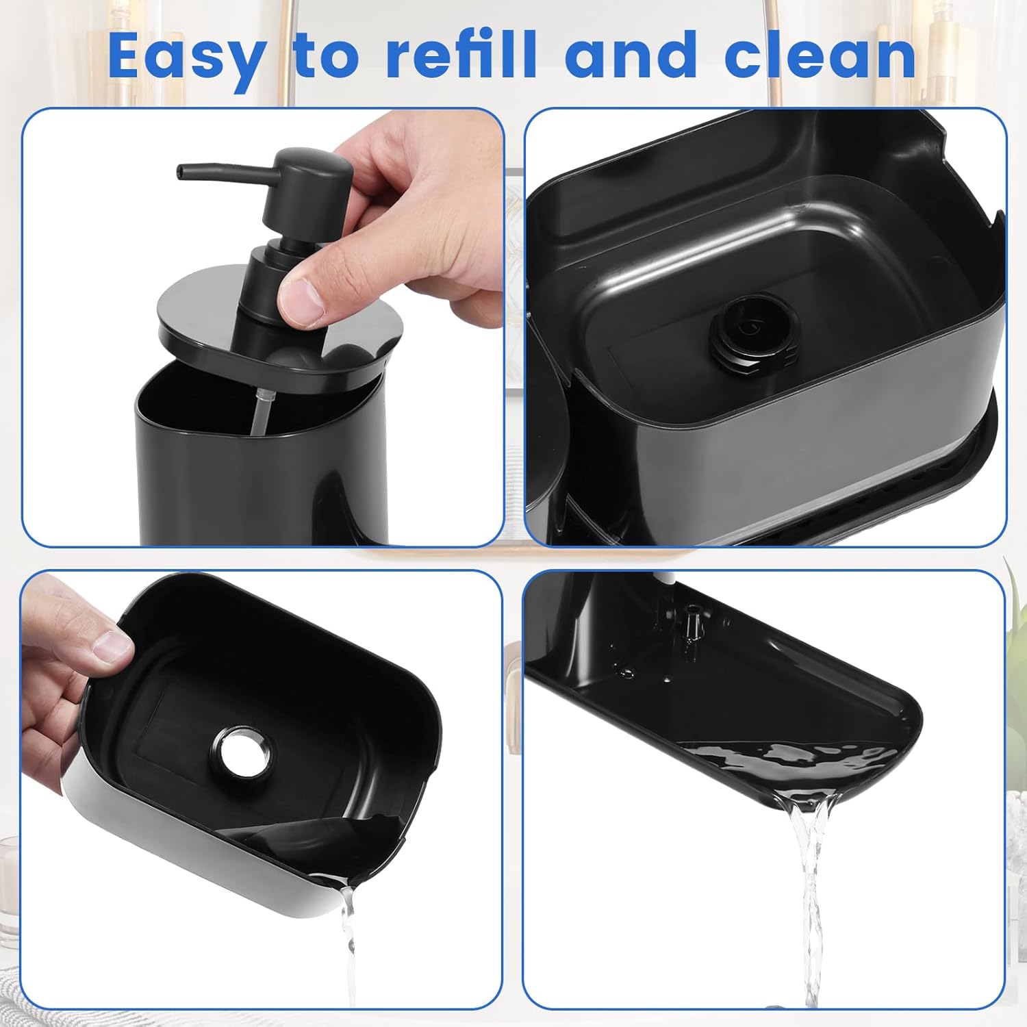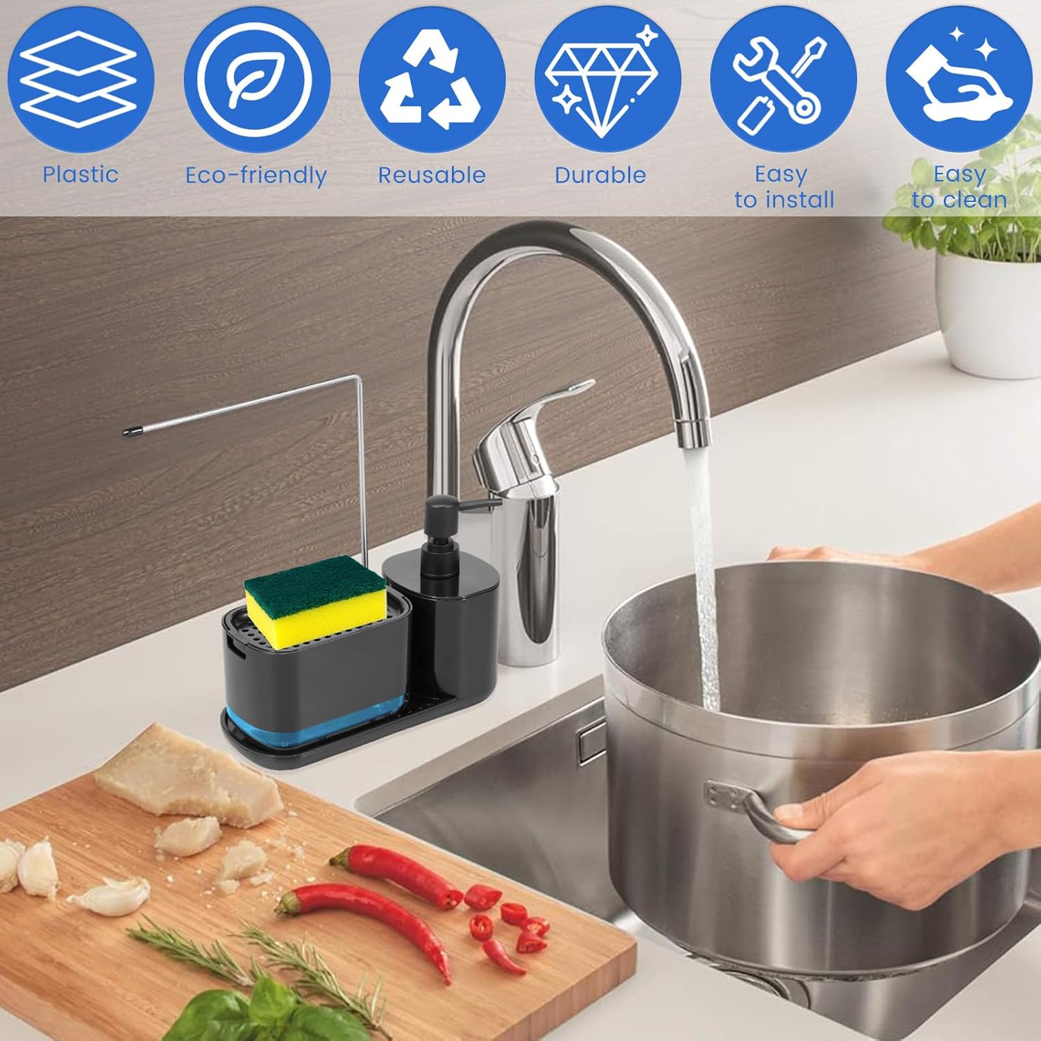 A multifunctional kitchen soap dispenser set designed to keep your sink area clean, organized, and efficient. It features two separate dispensers for hand soap and dishwashing liquid, along with a detachable drain tray, sponge holder, and stainless steel towel bar — perfect for maintaining a tidy and dry countertop.