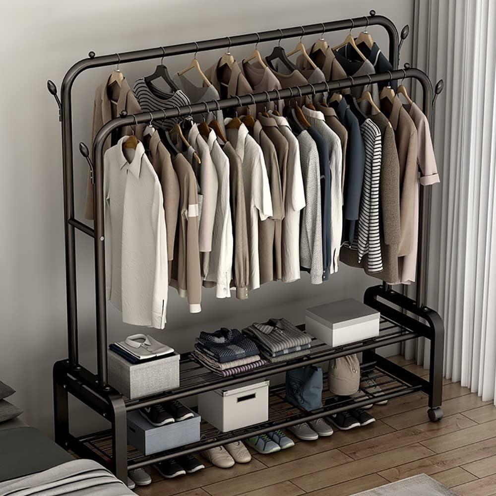 Multi-Layer Clothes Hanger Rack with Hooks & Wheels, Double Pole Clothes Rack with Wheels