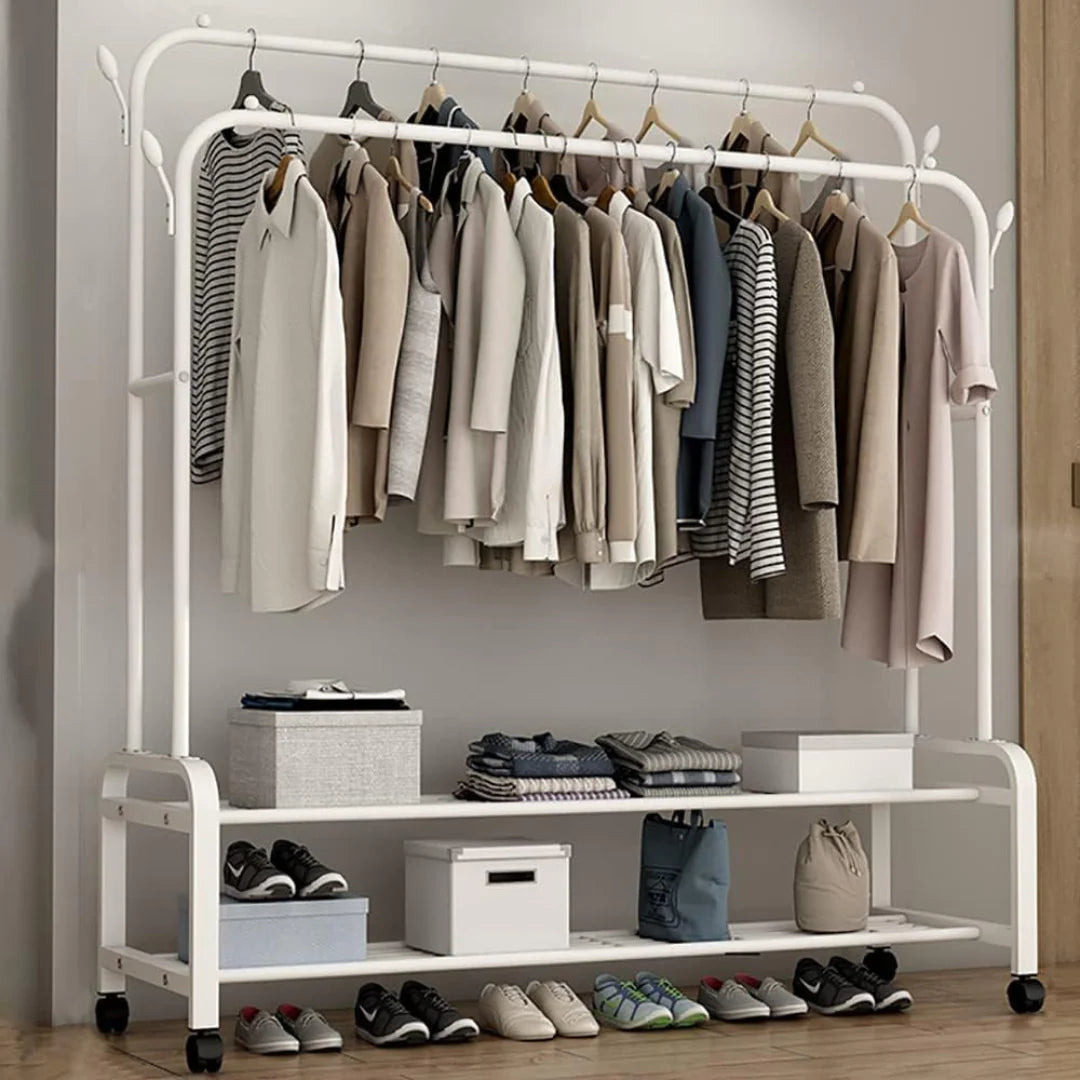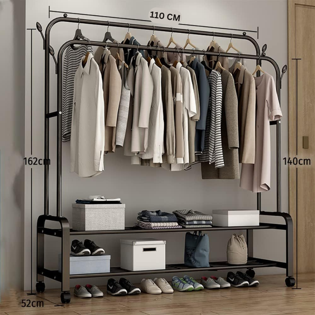 Keep your space organized with this double pole clothes hanger rack designed for both storage and mobility. Made with thickened steel pipes and a stable base, it supports up to 48 kg and is perfect for hanging clothes, hats, scarves, and bags. With multi-layer shelving and side hooks, it offers ample space for shoes and accessories. The smooth-rolling wheels allow easy movement, making it ideal for bedrooms, hallways, offices, and shops.