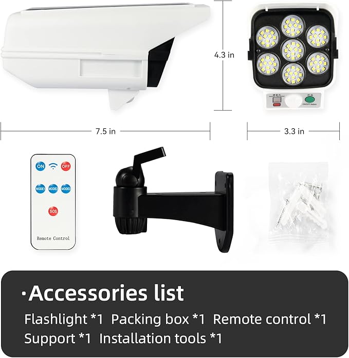 Solar Monitoring Light, designed to resemble a security camera for added deterrence. Equipped with a sensitive motion sensor, it detects movement up to 16 feet and offers three versatile lighting modes for customized use. With 77 high-quality LED beads, it delivers super bright illumination and reliable performance, even in harsh weather conditions. Easy to install, this light is perfect for securing yards, garages, driveways, and more.