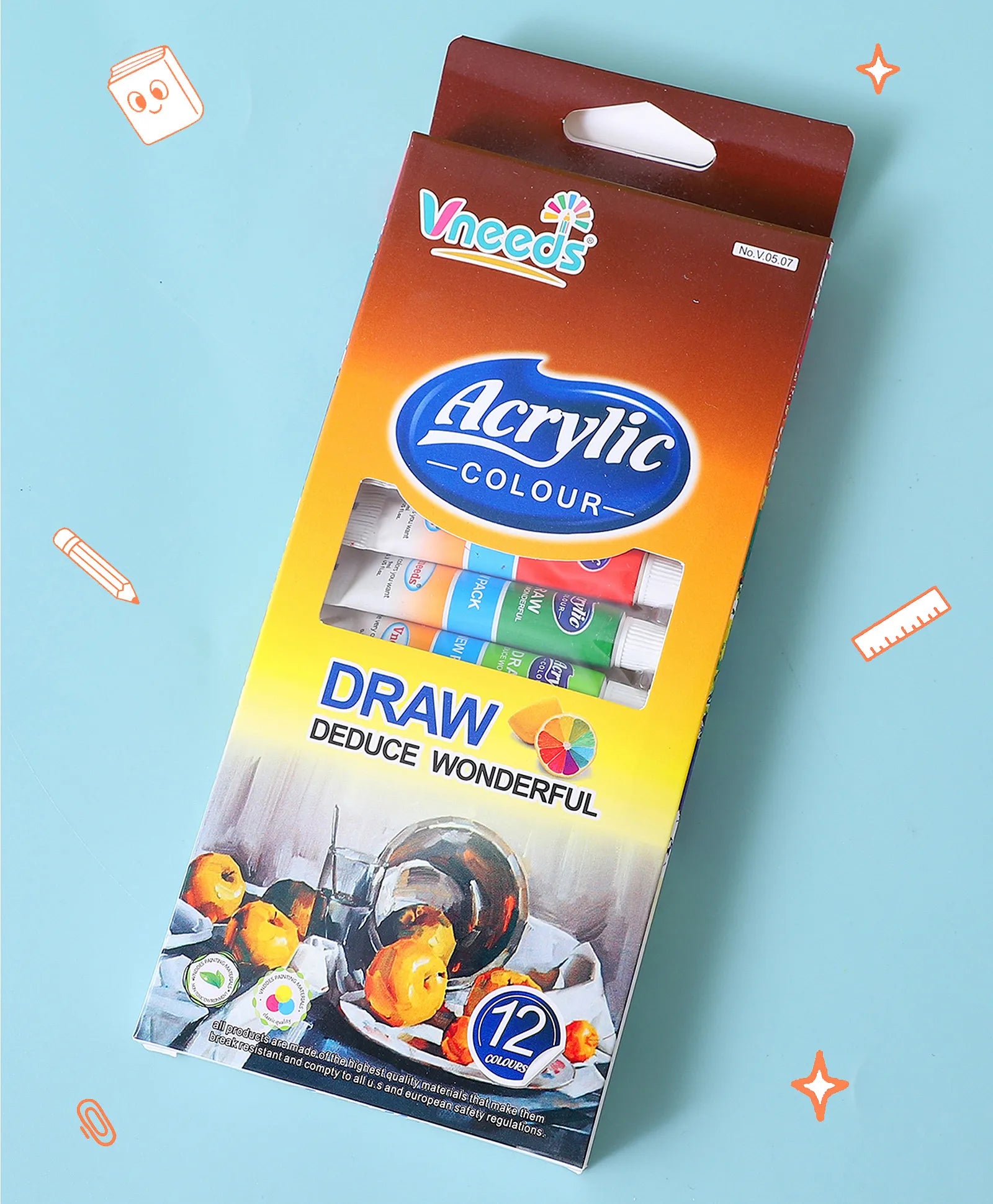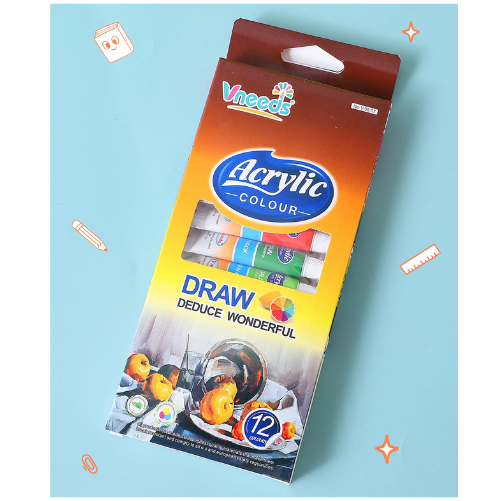 The Vndeeds Acrylic Tube Color set features 12 high-quality acrylic paints in vibrant, diverse shades. Designed for artists of all levels, these paints offer smooth application and excellent coverage on various surfaces like canvas, wood, and paper. The easy-to-use formula dries quickly to a durable finish, making it perfect for creative projects, school art, or professional work.